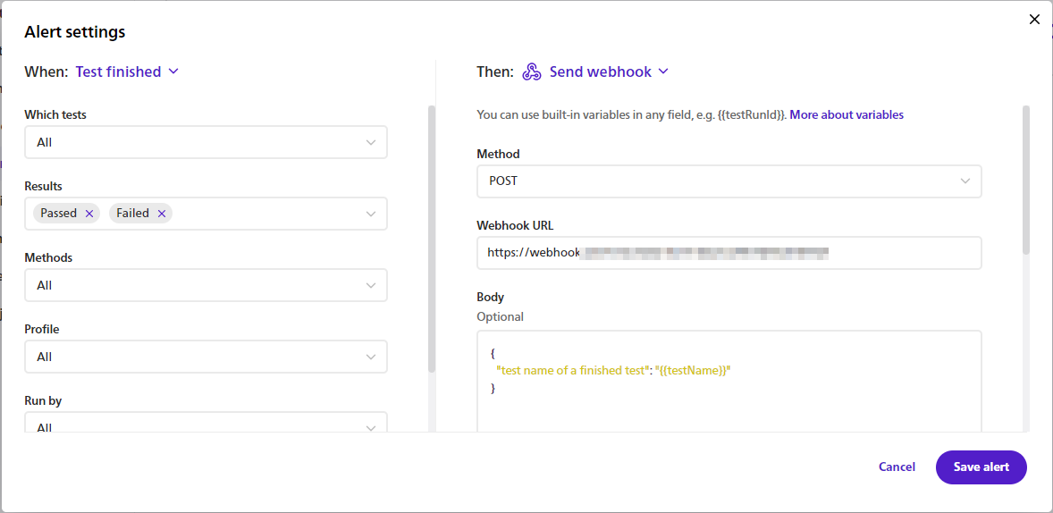 **Note**: You can use built-in variables in any field, e.g. **{{testRunId}}**.