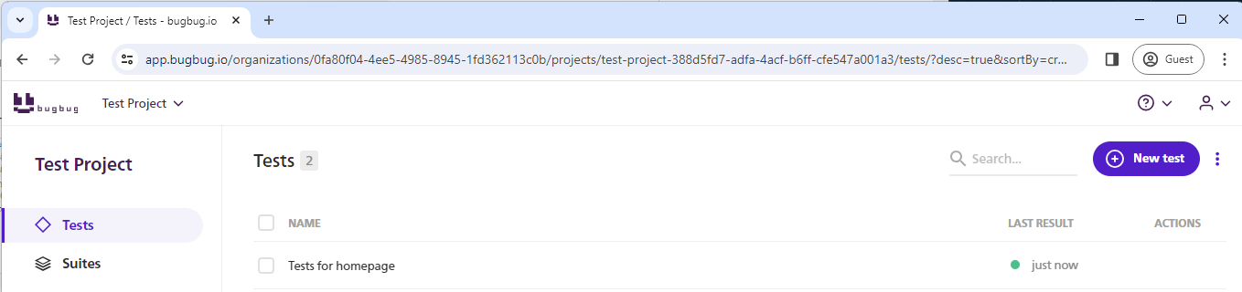 <figure><img src="https://3168433179-files.gitbook.io/~/files/v0/b/gitbook-x-prod.appspot.com/o/spaces%2F-MKixgeBPbLvnD0l1eiV%2Fuploads%2FLk9nRAc62kCuAKC0G13g%2F4_testsList.png?alt=media&#x26;token=978b098e-1a0a-44e7-ab75-c85432ad9ab0" alt=""><figcaption><p>List of created tests</p></figcaption></figure>