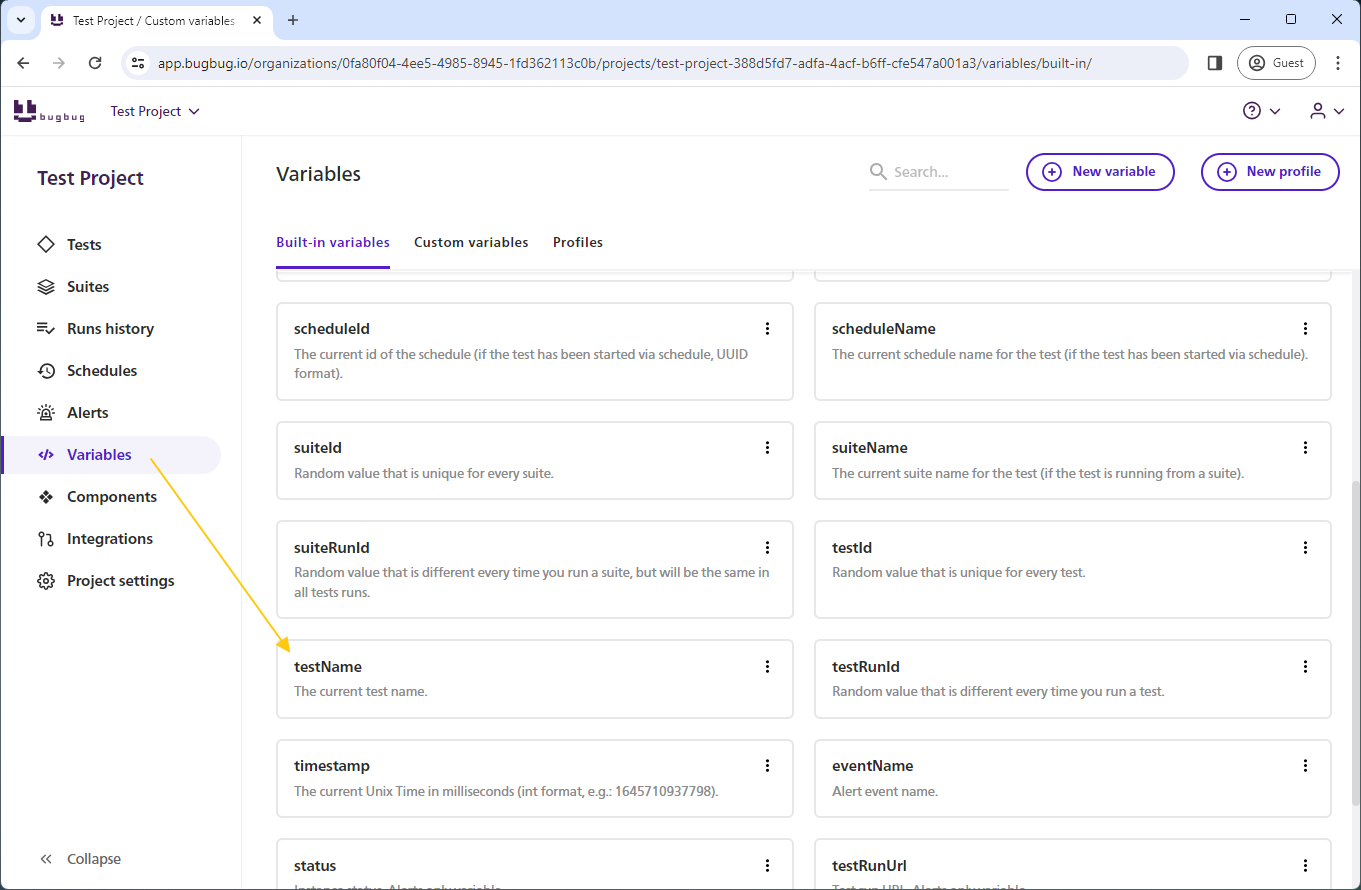 <figure><img src="https://3168433179-files.gitbook.io/~/files/v0/b/gitbook-x-prod.appspot.com/o/spaces%2F-MKixgeBPbLvnD0l1eiV%2Fuploads%2Fl2eLLPIIEVtKf3NCNUpD%2F5_testNameVar.png?alt=media&#x26;token=2705eca2-5402-4c71-a198-95b50f5a7ed3" alt=""><figcaption><p>List of built-in variables</p></figcaption></figure>